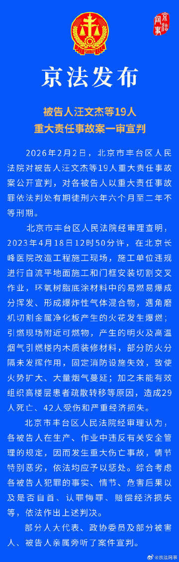 2026年2月2日线上配资之家,北京市丰台区人民法院对被告人汪文杰等19人重大责任事故案公开宣判,对各被告人以重大责任事故罪依法判处有期徒刑六年六个月至二年不等刑期。