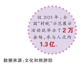 作为村民自编、自导、自演的乡村文化活动,“村晚”从2023年起常态化开展,以春、夏、秋、冬四季为周期为乡村群众搭建起常态化展示自我的舞台。文化和旅游部数据显示,仅2023年,全国“村晚”示范展示活动就举办了2万余场,参与人次约1.3亿。