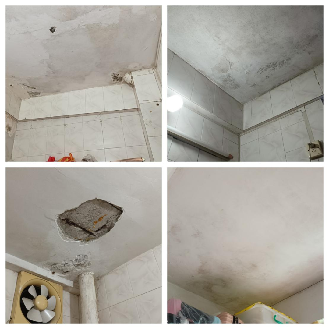 2023年,漏水情况愈发严重:厨房、阳台因长期渗漏脏水,导致出现楼板开裂、墙体剥落、霉点遍布,卫生间天花更是开始有粪水下渗,严重影响李姨的生活质量。